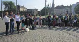 Posaunentag in Dresden (Foto: privat) Am nächsten Morgen ging es nach kurzem Einspielen zur Generalprobe ins Stadion von Dynamo-Dresden. Hier hat jeder einzelne Bläser, bei strahlendem Sonnenschein, besondere Eindrücke genossen. Bei ca. 15.000 Bläsern war Gänsehaut angesagt. Die Proben verliefen sehr erfolgreich. Ab 15.45 Uhr war eine Führung in der Frauenkirche vorgesehen, hier waren wir überrascht vom Inneren des Gotteshauses und beeindruckt von seiner Geschichte. Danach hatten wir einige Stunden zur freien Verfügung. Gegen 19.30 Uhr trafen wir uns an der Augustus-Brücke und konnten einem Sängertreffen zuhören, bevor wir dann wieder am gemeinsamen Blasen am Elbufer teilnehmen mussten. Hier wurden auch wieder zwei Chöre gebildet, die sich im Abstand von ca. 100 Metern positionierten. Vom jeweils eigenen Dirigenten geführt und von sehr schönen Kommentaren begleitet, kam es zu einem kulturellen und musikalischen Großereignis, welches von vielen tausend Besuchern mit Beifall belohnt wurde. Der krönende Abschluss bildete gegen 23.00 Uhr ein Feuerwerk. Am Sonntagmorgen haben die beiden Chöre vor dem Hotel ein kleines Platzkonzert präsentiert, dem sich spontan einige fremde Bläser angeschlossen haben. Danach ging es hoch motiviert zum Abschlussgottesdienst ins Stadion. Bei der Abschlussveranstaltung waren die Bläserinnen und Bläser unter der direkten Sonneneinstrahlung extrem gefordert, was sie mit großer Geduld erfolgreich gemeistert haben. Beide Chöre konnten durch ihre Teilnahme am Posaunentag in Dresden viele positive Eindrücke verbuchen. Gegen 22.00 Uhr am Sonntag sind wir in Hamminkeln nach einer entspannten Fahrt angekommen. Ihr Posaunenchor